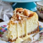 A rich and creamy Amaretto Cheesecake featuring a crunchy vanilla wafer and almond crust topped with toasted almonds and served with a luscious Amaretto cream sauce. Perfectly baked to a silky texture with the subtle flavor of amaretto liqueur infused throughout.