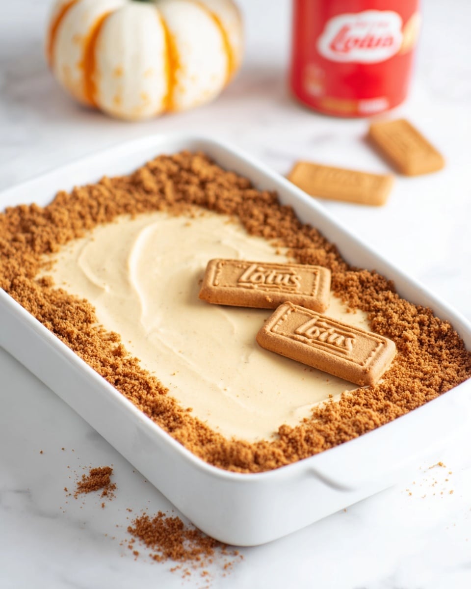 - Slice and Garnish: Serve individual slices with a dollop of whipped topping, a whole Biscoff cookie, and some crushed cookie crumbles to enhance presentation and flavor.