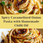 A flavorful and comforting Caramelized Onion Pasta with a spicy homemade chili oil drizzle. Sweet, deeply caramelized onions are combined with al dente pasta and topped with a fragrant chili oil infused with garlic and smoked paprika, optionally garnished with fresh parsley and Parmesan cheese for an extra touch of richness.
