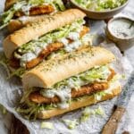 These Chicken Caesar Sandwiches feature crispy fried chicken cutlets layered with a creamy homemade Caesar dressing, garlic butter-toasted hoagie rolls, and fresh romaine lettuce for a delightful sandwich that’s bursting with classic flavors.