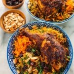 Chicken Kabsa is a fragrant and flavorful traditional Middle Eastern dish featuring succulent roasted chicken leg quarters infused with a rich blend of spices, served atop aromatic basmati rice cooked in a savory tomato and spice broth. This dish combines the deep savory flavors of whole and ground spices with tender chicken and fluffy rice, garnished with a delightful mix of sweet and crunchy toppings for a complete and comforting meal.