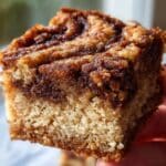 A close-up of a square piece of cinnamon cake held by a woman's hand with a white marbled texture background. The cake has two main layers: a light brown, coarse textured base that looks soft and moist, and a thicker, darker brown cinnamon swirl layer on top with a slightly glossy, sugared surface showing cinnamon spirals and a crunchy texture. The top layer has a rough, uneven pattern from the cinnamon mixture. Photo taken with an iphone --ar 4:5 --v 7
