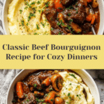 Classic Beef Bourguignon is a rich and hearty French stew that combines tender beef with red wine, mushrooms, and aromatic herbs. This comforting dish is perfect for a cozy dinner and is sure to impress family and friends with its deep, savory flavors.