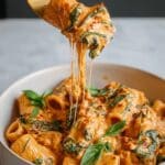 The image shows a close-up of rigatoni pasta richly coated in a creamy orange sauce with specks of green herbs and full pieces of spinach leaves on top. The sauce looks thick and cheesy, stretching up with melted cheese strands as a gold fork lifts a piece of pasta from the bowl. The rigatoni pieces are tubular and layered closely together in a white bowl placed on a white marbled surface. The sauce has a smooth texture with visible bits of tomato and herbs mixed in, creating a warm and inviting look. Photo taken with an iphone --ar 4:5 --v 7