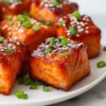 The image shows several thick pieces of salmon cubes arranged closely on a white plate. Each salmon piece has a shiny, rich orange glaze with a slightly caramelized texture on top. Small white sesame seeds are sprinkled over the surface of the salmon cubes, adding texture. Bright green chopped green onions are scattered on top and around the salmon pieces. The plate sits on a white marbled surface, enhancing the fresh and clean look of the dish. Photo taken with an iphone --ar 4:5 --v 7