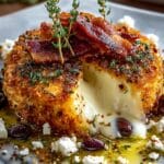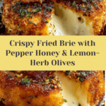 This gourmet appetizer features a crispy fried Brie wheel served with warm lemon-herb olives, crispy prosciutto, and a drizzle of peppered honey for a perfect balance of savory, sweet, and spicy flavors. Ideal for entertaining, this dish combines crunchy textures with rich, melty cheese and fragrant herbs for an unforgettable starter.