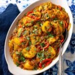 Dopiazeh Aloo is a flavorful Persian potato curry featuring tender Yukon gold potatoes simmered in a savory tomato-based sauce with caramelized onions, bell peppers, aromatic garlic, ginger, and warm spices like turmeric, cumin, and coriander. This vibrant dish is finished with fresh lime juice and cilantro for a refreshing touch, perfect as a comforting vegetarian main or side.