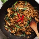Drunken noodles, or Pad Kee Mao, is a popular Thai stir-fried noodle dish known for its bold flavors and satisfying heat. This recipe combines tender chicken, fresh vegetables, and fragrant holy basil with wide rice noodles for a deliciously smoky and spicy meal.