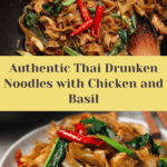 Authentic Thai Drunken Noodles, also known as Pad Kee Mao, feature wide rice noodles stir-fried with tender chicken, fragrant holy basil, spicy Thai chilies, and vibrant baby bok choy. This dish balances savory, spicy, and slightly sweet flavors, finished with a smoky char from high-heat stir-frying, making it a perfect bold-flavored meal.