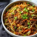Keywords: egg roll in a bowl, Asian ground beef skillet, low carb egg roll recipe, easy weeknight dinner, stir fry bowl