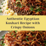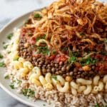 Egyptian Koshari is a hearty and flavorful vegan dish combining lentils, rice, macaroni, and a savory tomato sauce with garlic and spices. Topped with crispy fried onions and fresh parsley, it offers a satisfying blend of textures and rich Middle Eastern flavors perfect for a comforting meal.