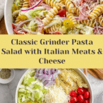 A vibrant and flavorful Grinder Pasta Salad combining rotini pasta with a medley of Italian deli meats, cheeses, fresh vegetables, and a zesty homemade dressing. Perfect as a hearty side dish or light main course, this salad offers a delightful blend of textures and tangy flavors, chilled and ready to enjoy after a few hours of marinating.