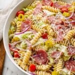 A vibrant and flavorful Grinder Pasta Salad combining rotini pasta with a medley of Italian deli meats, cheeses, fresh vegetables, and a zesty homemade dressing. Perfect as a hearty side dish or light main course, this salad offers a delightful blend of textures and tangy flavors, chilled and ready to enjoy after a few hours of marinating.