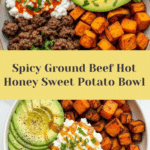This Ground Beef Hot Honey Bowl is a flavorful and balanced meal featuring spiced roasted sweet potatoes, seasoned ground beef, creamy avocado, and cottage cheese all drizzled with a sweet and spicy hot honey glaze. It combines savory and sweet elements for a comforting and nutritious dish perfect for lunch or dinner.