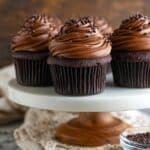 Deliciously moist and rich homemade chocolate cupcakes topped with a decadent semi-sweet chocolate buttercream frosting. Perfectly tender cupcakes baked at a low temperature to maintain moisture, finished with a smooth, creamy chocolate buttercream that’s both indulgent and satisfying.
