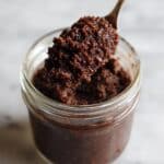A close-up of a clear glass jar filled with a thick, dark brown paste that has a coarse, grainy texture showing small bits and seeds throughout. A spoon is scooping out a generous dollop of the paste, held just above the jar's opening, highlighting its dense and moist consistency. The background features a white marbled texture. photo taken with an iphone --ar 4:5 --v 7