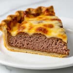 A close-up image of a single slice of meat pie placed on a white plate. The bottom layer is a golden brown pie crust with a slightly flaky texture. Above the crust is a thick, textured layer of cooked ground meat in a rich brown color, tightly packed. The top layer is melted cheese, glossy and bubbling, showing shades of golden yellow and light brown where it has browned. The edges of the crust are crimped and browned, giving the pie a rustic look. The whole scene is set on a white marbled surface. photo taken with an iphone --ar 4:5 --v 7