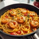 Store leftover shrimp pasta in an airtight container in the refrigerator for up to 2 days. Reheat gently on the stove over low heat, adding a splash of water or coconut milk to loosen the sauce if it has thickened. Avoid microwaving at high heat to prevent the shrimp from becoming rubbery.