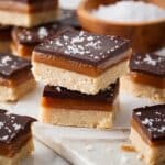 Keywords: Millionaire Shortbread, layered dessert, caramel shortbread, chocolate ganache, easy dessert, sea salt garnish