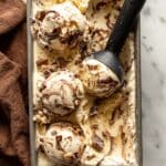 - Layer Ice Cream with Fudge and Peanut Butter Cups: Transfer half of the churned ice cream into an airtight container. Spoon half a cup of hot fudge sauce and half the Reese’s pieces over it. Gently stir to combine. Add the remaining ice cream, fudge sauce, and peanut butter cups on top, stirring gently again to swirl the ingredients throughout.