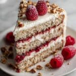 - Frost and Decorate: Frost the exterior of the assembled cake with the remaining vegan cream cheese frosting. Decorate the top with fresh raspberries and sprinkle crushed almonds evenly around the top and sides for a beautiful finish.