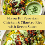 This Peruvian Chicken and Rice recipe features juicy marinated chicken grilled or baked to perfection, served alongside fragrant turmeric jasmine rice with peas, and topped with a vibrant, creamy cilantro jalapeño green sauce. The dish combines bold Peruvian-inspired flavors like cumin, smoked paprika, lime, and fresh cilantro for a deliciously balanced meal perfect for any occasion.