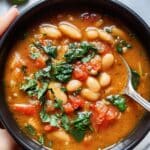 A close-up view of a dark gray bowl filled with thick orange stew containing white beans, chopped green leafy vegetables, and chunks of red tomatoes, held by a woman's hand on the left side. The stew has a slightly chunky texture and is full of visible ingredients mixed evenly throughout. In the background, slightly out of focus on a white marbled surface, are two small round pieces of soft bread. Photo taken with an iphone --ar 4:5 --v 7