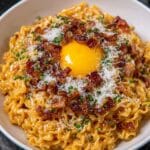 This Ramen Carbonara recipe is a delicious fusion dish blending the creamy richness of traditional Italian carbonara with the spicy kick of Korean gochujang and savory ramen noodles. Featuring crispy bacon, garlic, and a creamy parmesan egg sauce, it offers a unique, flavorful twist perfect for a quick and comforting meal.