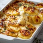 This Rich Potato Gratin recipe features layers of thinly sliced potatoes smothered in a creamy, cheesy béchamel sauce made with garlic, onion, thyme, and Gruyère cheese. Baked to golden perfection, this indulgent dish is perfect as a comforting side or a special occasion centerpiece.
