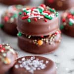 - Add salt topping: Place the dipped sandwiches back onto the lined baking sheet and immediately sprinkle sea salt or your choice of sprinkles over the top to enhance flavor.
