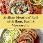 This Sicilian Meatloaf recipe is a flavorful twist on classic meatloaf, featuring a savory blend of ground beef, sautéed red peppers and onions, Italian-style breadcrumbs, parmesan, and fresh herbs. Rolled jelly-roll style with layers of deli ham, fresh basil, and mozzarella cheese, this meatloaf is baked to perfection and served with marinara sauce, making it a delicious and hearty meal perfect for any occasion.