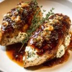 Two cooked chicken breasts lie side by side on a white plate, each topped with a creamy white cheese layer stuffed inside small cuts. Over each chicken breast, there is a thick, dark reddish-brown glaze covered with tiny herbs sprinkled on top, and fresh green sprigs of thyme rest delicately across the cheeses. The plate sits on a white marbled surface, with shiny sauce pooling lightly around the chicken, showing a rich, moist texture. photo taken with an iphone --ar 4:5 --v 7