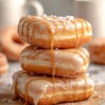 Three square donuts are stacked on top of each other on a piece of brown paper over a white marbled surface. Each donut is golden brown with a smooth, shiny layer of light beige glaze that drips slightly down the sides. Thin lines of caramel sauce drizzle over the glaze, adding a glossy texture. Small granules of coarse sea salt sprinkle on top, catching the light. In the background, out of focus, there are white mugs and more donuts. Photo taken with an iphone --ar 4:5 --v 7