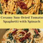 A luscious and creamy spaghetti dish featuring a sun-dried tomato cream sauce infused with garlic and fresh spinach, perfect for a comforting yet flavorful Italian-inspired meal.