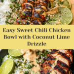 This Sweet Chili Chicken Bowl with Coconut Lime Drizzle is a vibrant and flavorful dish featuring tender grilled chicken thighs marinated in sweet chili and soy sauce, served over fragrant jasmine rice. The dish is elevated by a creamy and tangy coconut lime drizzle, fresh herbs, and optional heat from chili sauce, making it a perfect balance of sweet, spicy, and refreshing flavors for a quick and satisfying meal.
