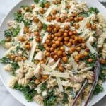 This Kale Chicken Caesar Pasta Salad combines hearty fusilli pasta with tender grilled chicken, crispy roasted chickpeas, and fresh kale, all tossed in a creamy Greek yogurt Caesar dressing. It’s a delicious, protein-packed salad perfect for lunch or a light dinner.